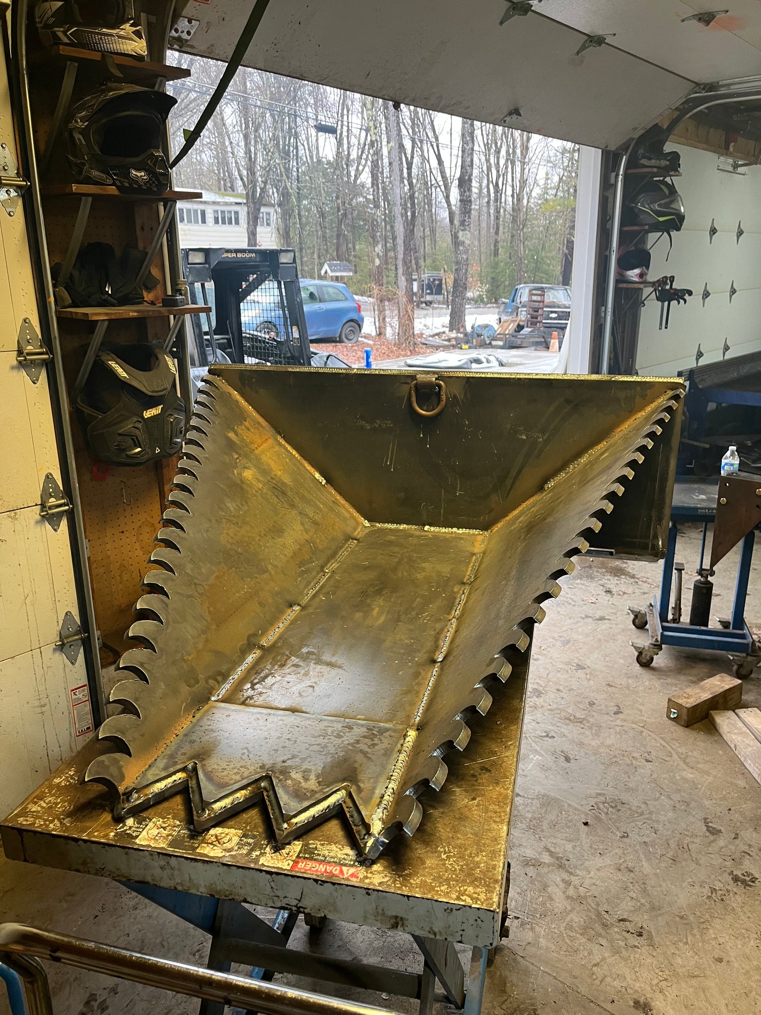 Built for a local landscaping company, This attachment is all CNC Plasma cut 1/2" thick steel plate with reinforced 1" thick spade plate for digging up anything in its path. Used for clearing small stumps and digging trenches through tough terrain.