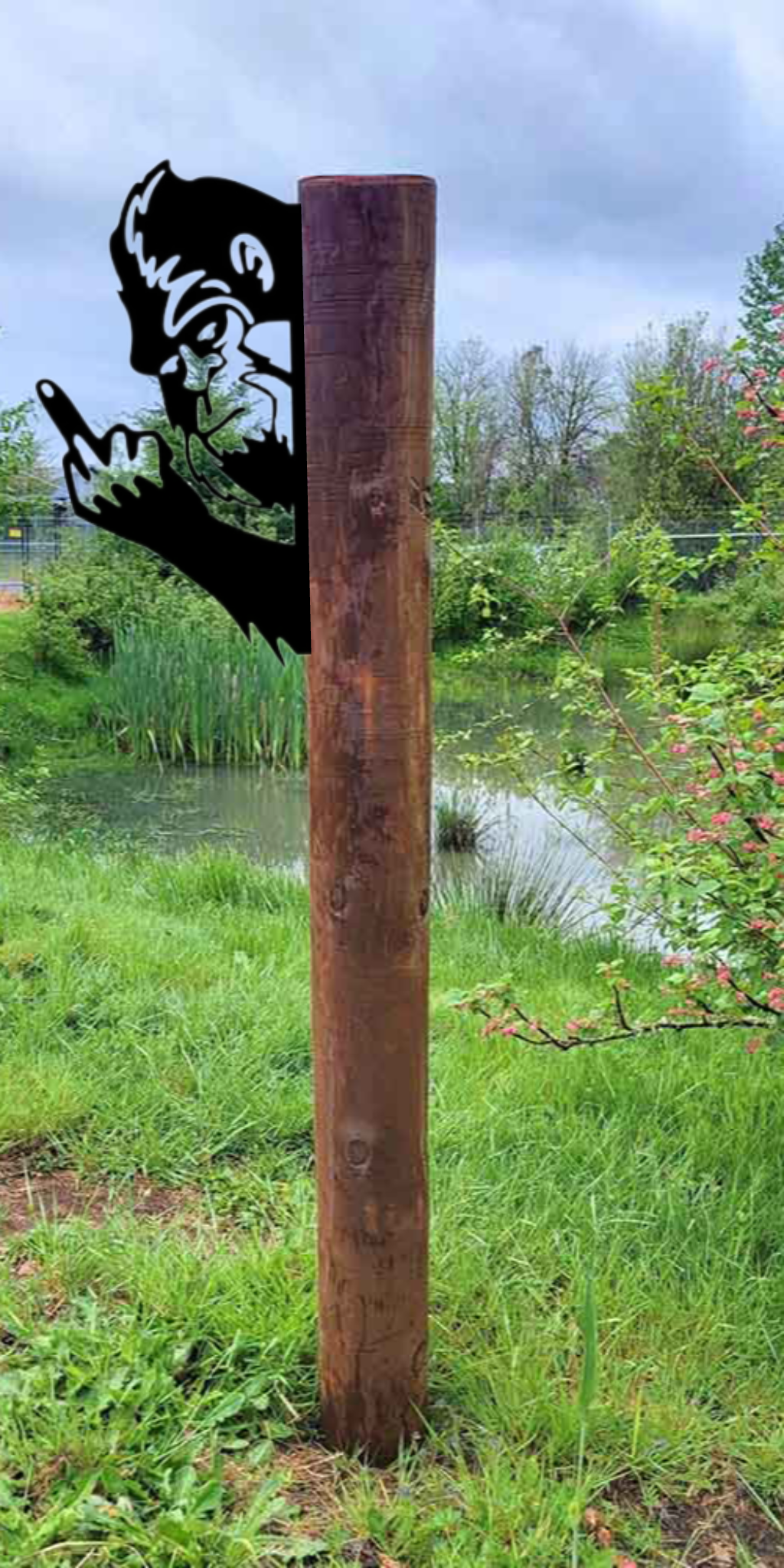 Big Foot FU is a sturdy and humorous addition to any outdoor space. Made from 1/8 steel, this Bigfoot is built to last and can be easily mounted on a post or edge. Bring a smile to your face with this guaranteed conversation starter.